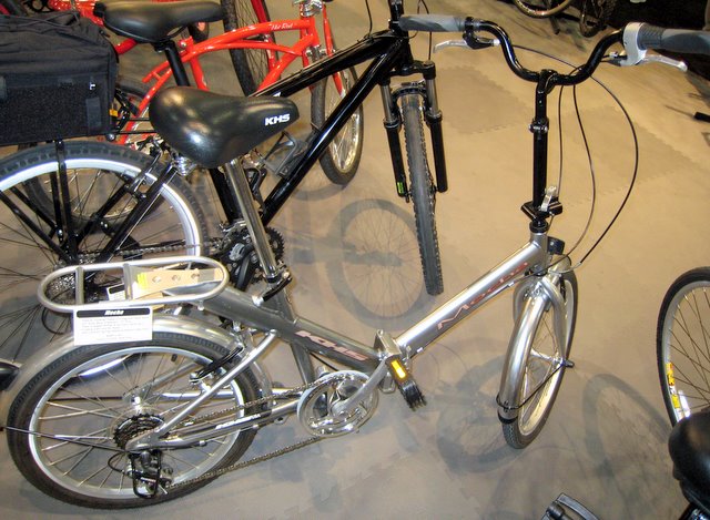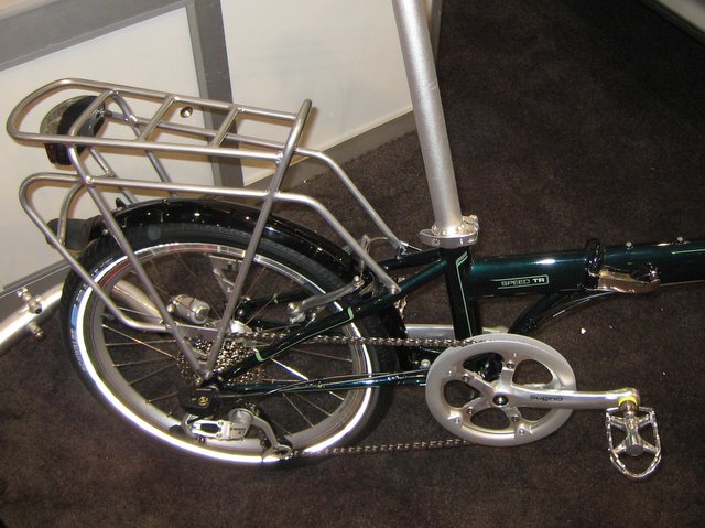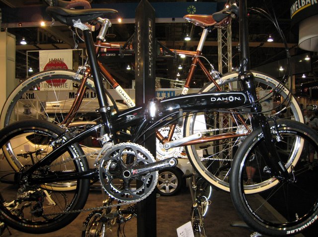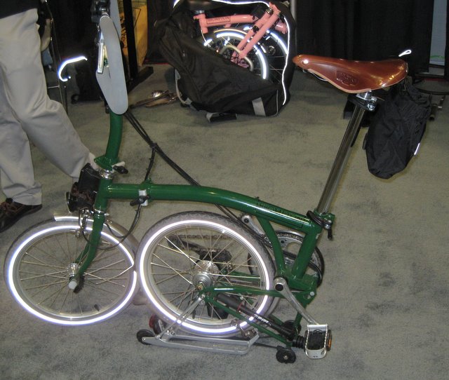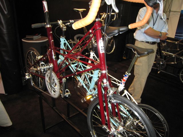 Brompton told me that they've received a trademark for their curved shaped frame. Other curved shape frame bicycles like the Dahon Mu are violating the trademark, but it's not clear what, if anything, Andrew Ritchie can do about it. Apparently Brompton is still the only folder where the chain is on the inside when the bike is folded.