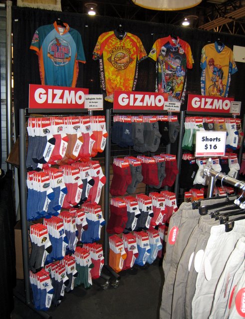 Clothing, with its high margins, was big at the show, and some exhibitors were selling samples. I ended up with a whole new wardrobe. From a pair of University of Florida socks ($4.50), to a Phil Wood shirt ($10), and a pair of trekking shorts ($16), to a free Dahon tee shirt.