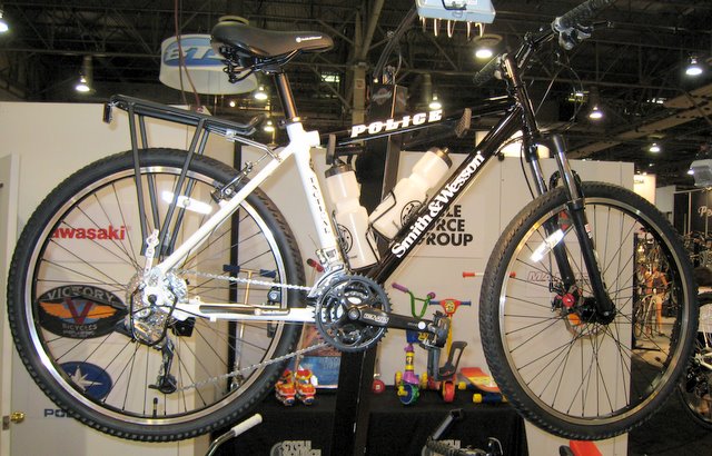 Smith and Wesson bike with an awkwardly mounted rear rack.