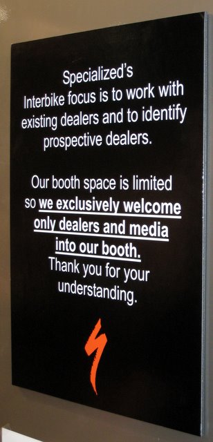 Welcome to our booth, now please get lost. This was weird. Specialized had a large booth, enclosed on all four sides, and would not let anyone other than their existing dealers in. Usually when you take this approach at a show you rent a hotel suite for a lot less money than show floor space. What were they thinking? Nearly every attendee could be a prospective dealer. All they did was make themselves look like jerks. They need a new marketing v.p.. They should just stay home like Trek does.