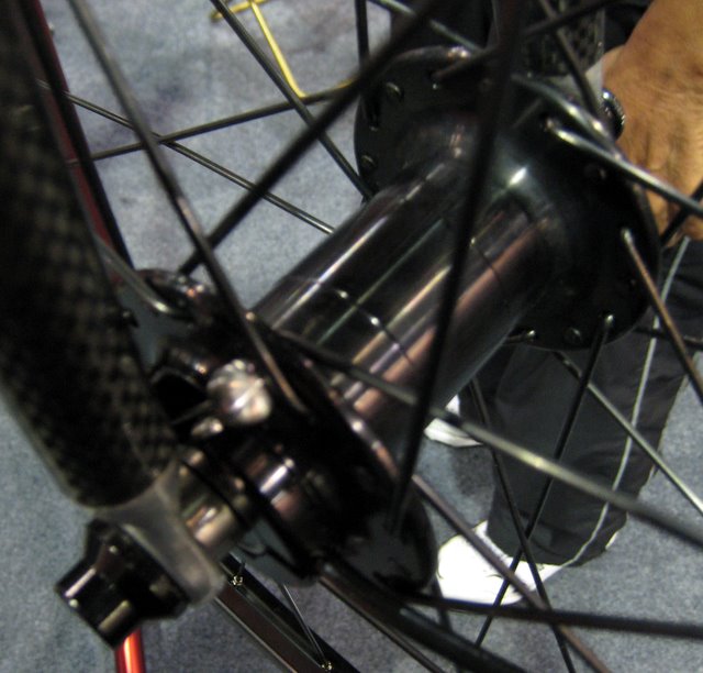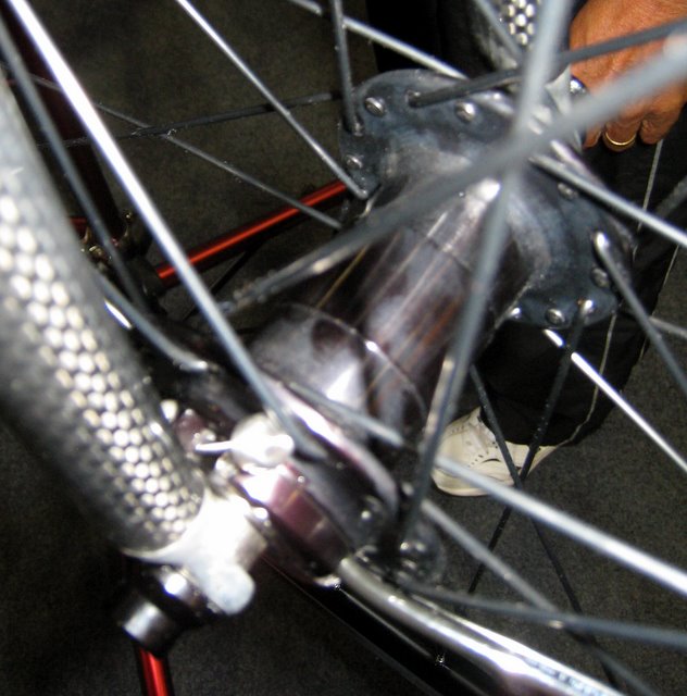 It's hard to see what this is about. OMG, how did I live without an air pump in my hubs for so long? A hose connects the hub the valve. You push a button, then get on and ride, and the tire inflates up to a pressure pre-set with an adjustment screw. Bizarre.